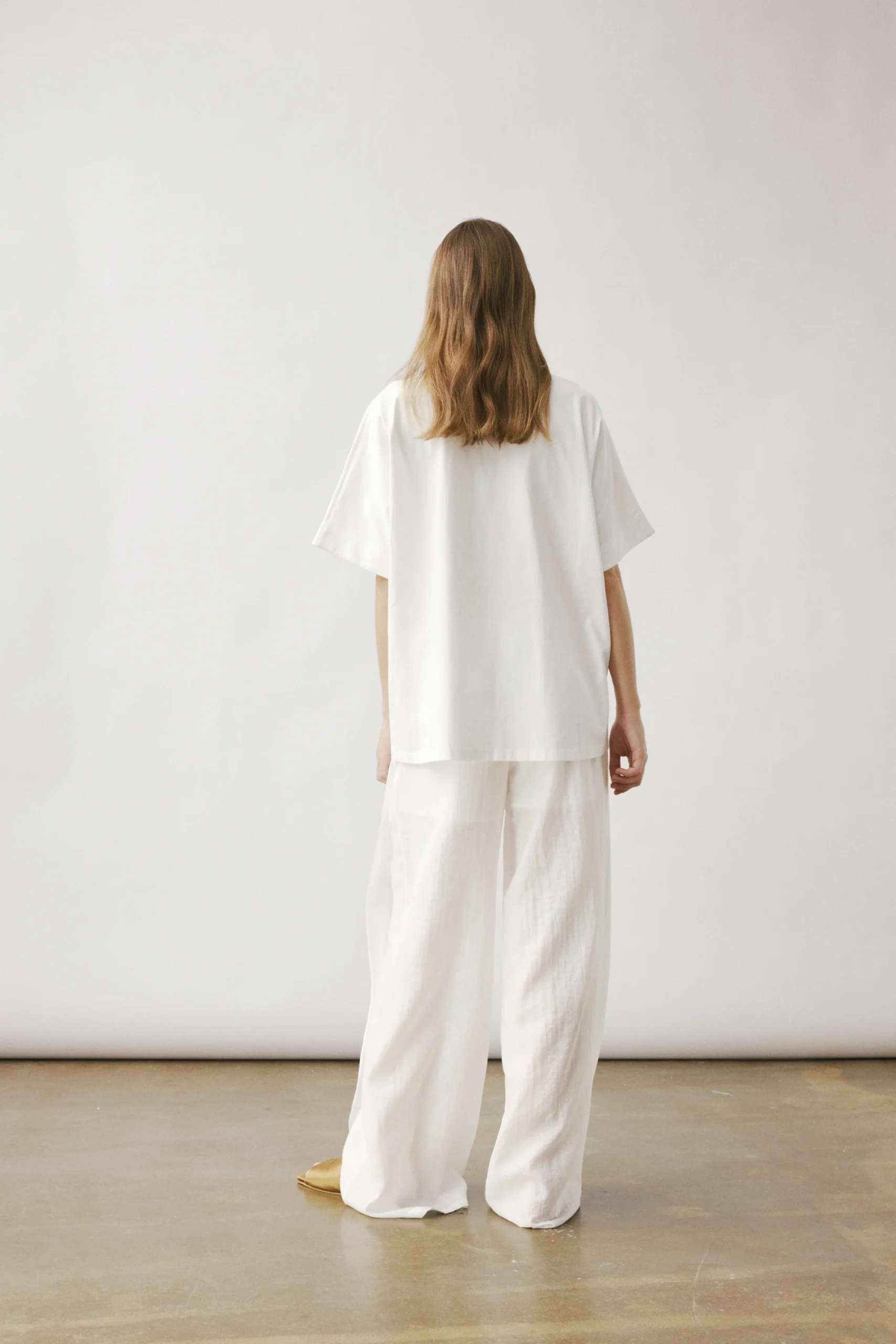 AN OVERSIZED T-SHIRT WITH WIDE SLEEVES, FEATURING A GATHERED TWIST DETAIL ON ONE SIDE OF THE CHEST, GIVING THE EFFECT THAT THE BRAND LOGO IS SUBTLY PULLING AND TWISTING THE FABRIC.