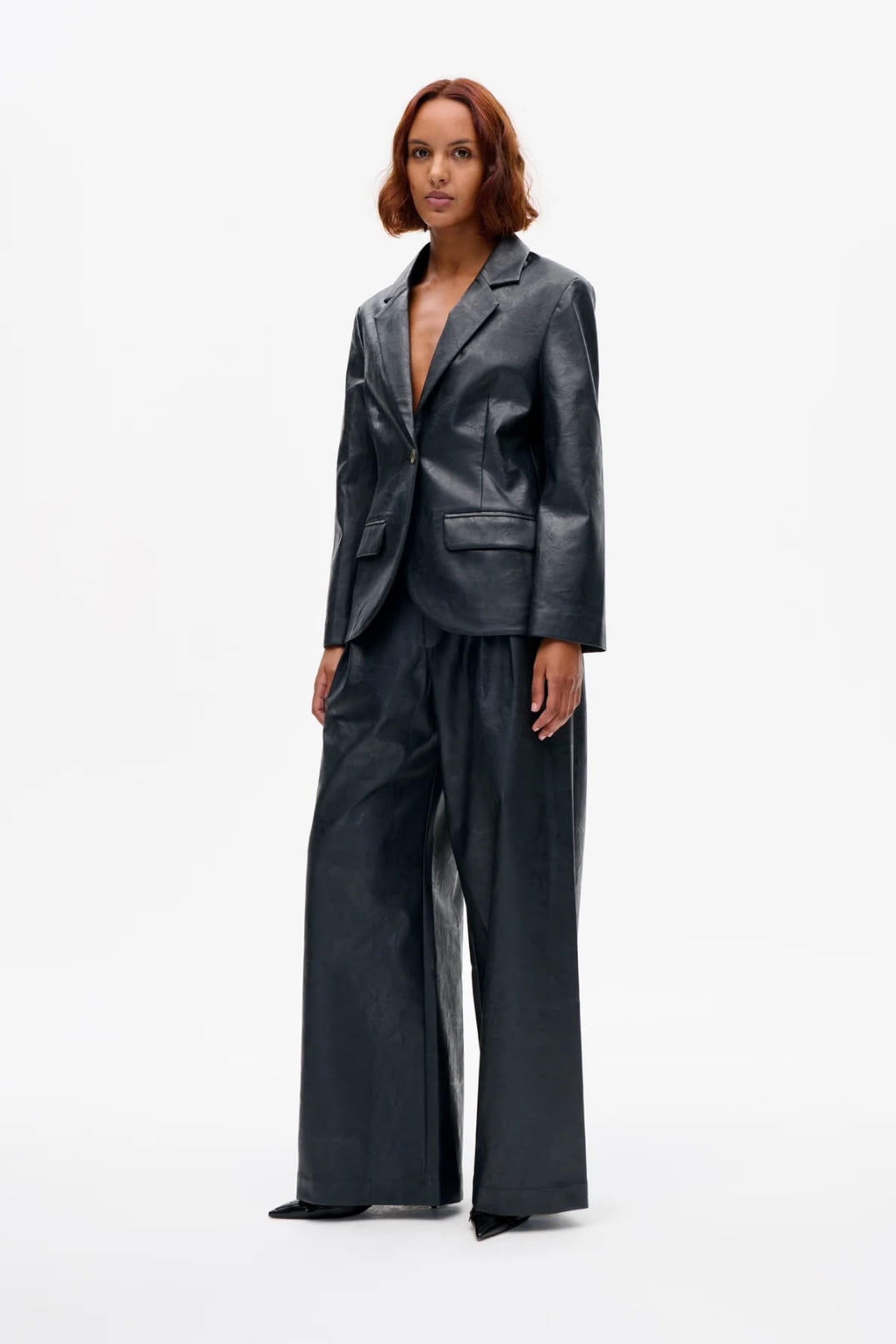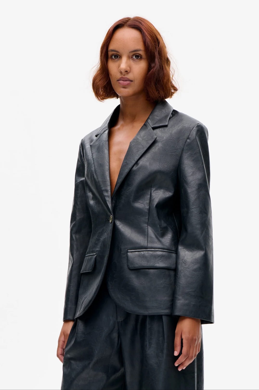 THE BENETTE JACKET IS MADE IN CRACKED FAUX LEATHER.