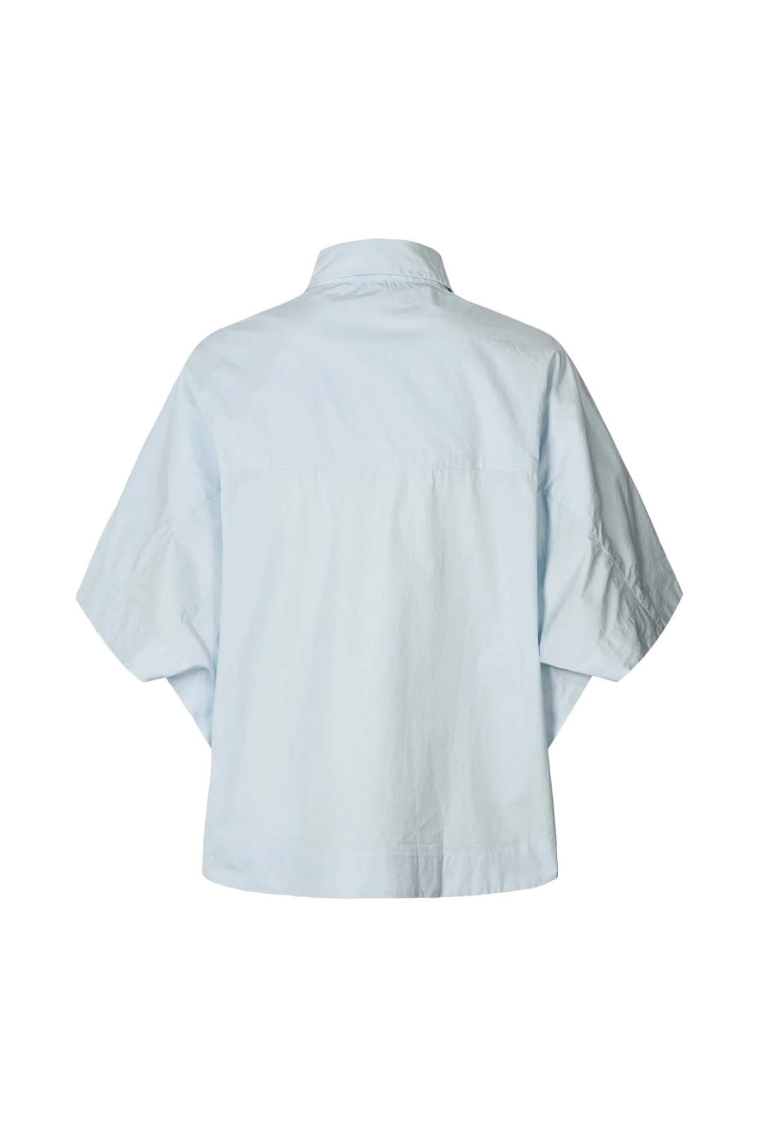 THE SHIRT FEATURES A BOXY, SHORT FIT WITH MID-LENGTH, OVERSIZED SLEEVES, A FULL BUTTON-DOWN FRONT, A CHEST POCKET, AND A ROUNDED HEM.