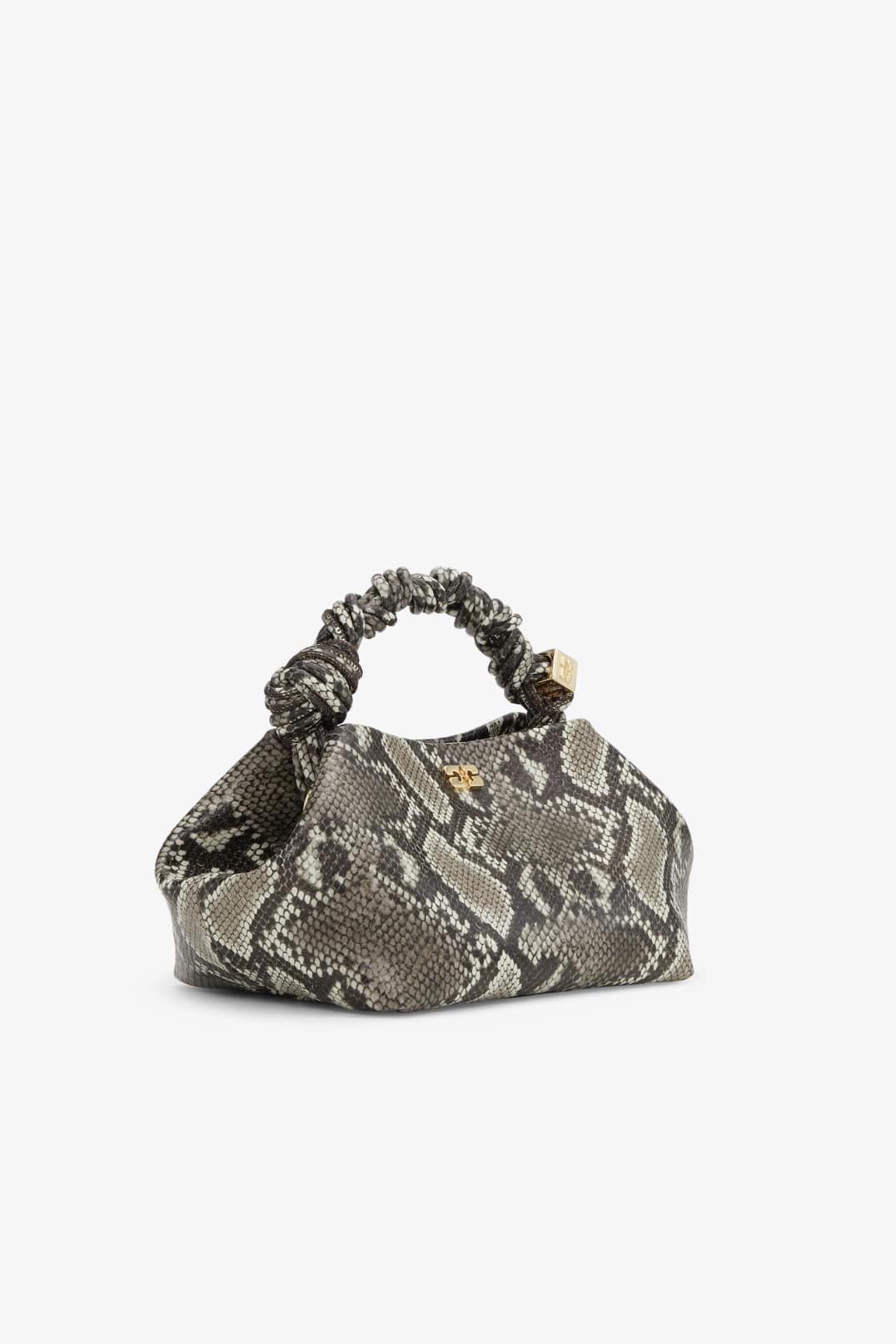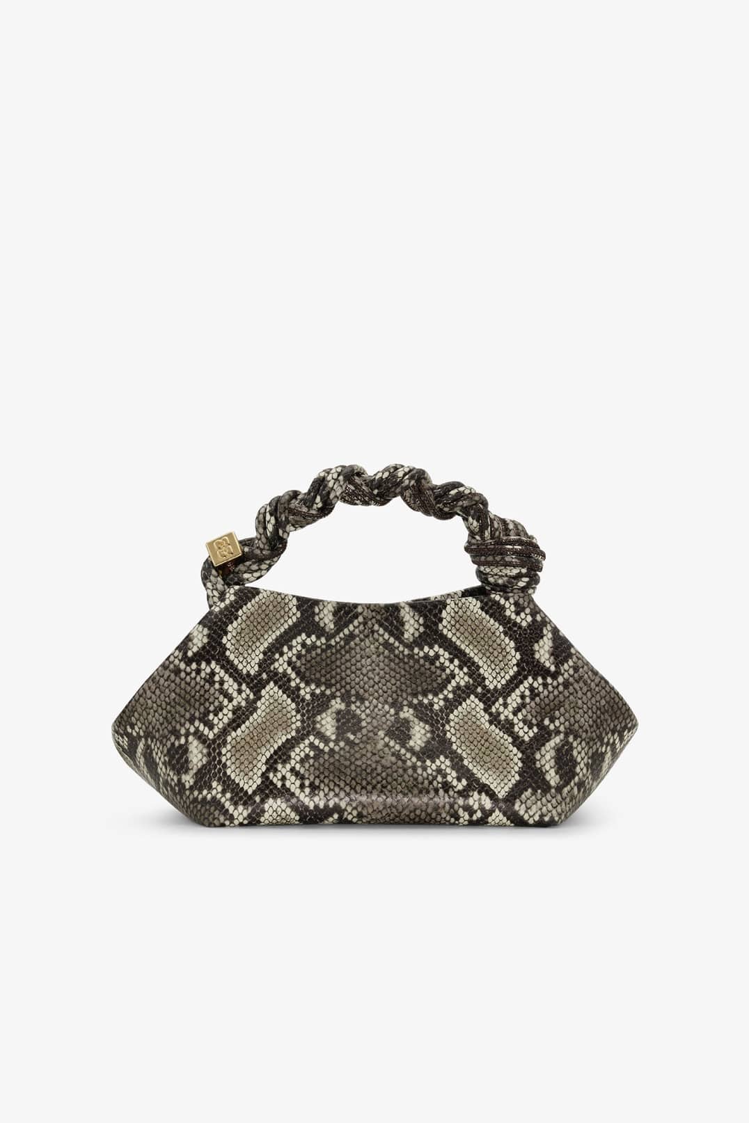 THIS BAG FEATURES A TEXTURED SNAKE PRINT, A HEXAGONAL SHAPE, A BRAIDED TOP HANDLE WITH A BRAIDED KNOT AND AN ADJUSTABLE AND REMOVABLE SHOULDER STRAP.
