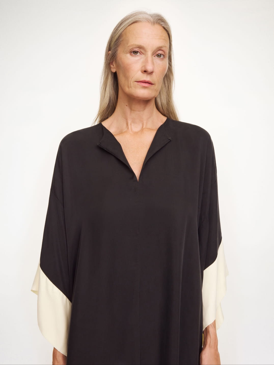 THE SQUARE SILHOUETTE WITH CROPPED SLEEVES HAS A DEEP NECKLINE – TO BE LEFT OPEN OR CLOSED DEPENDING ON YOUR MOOD.