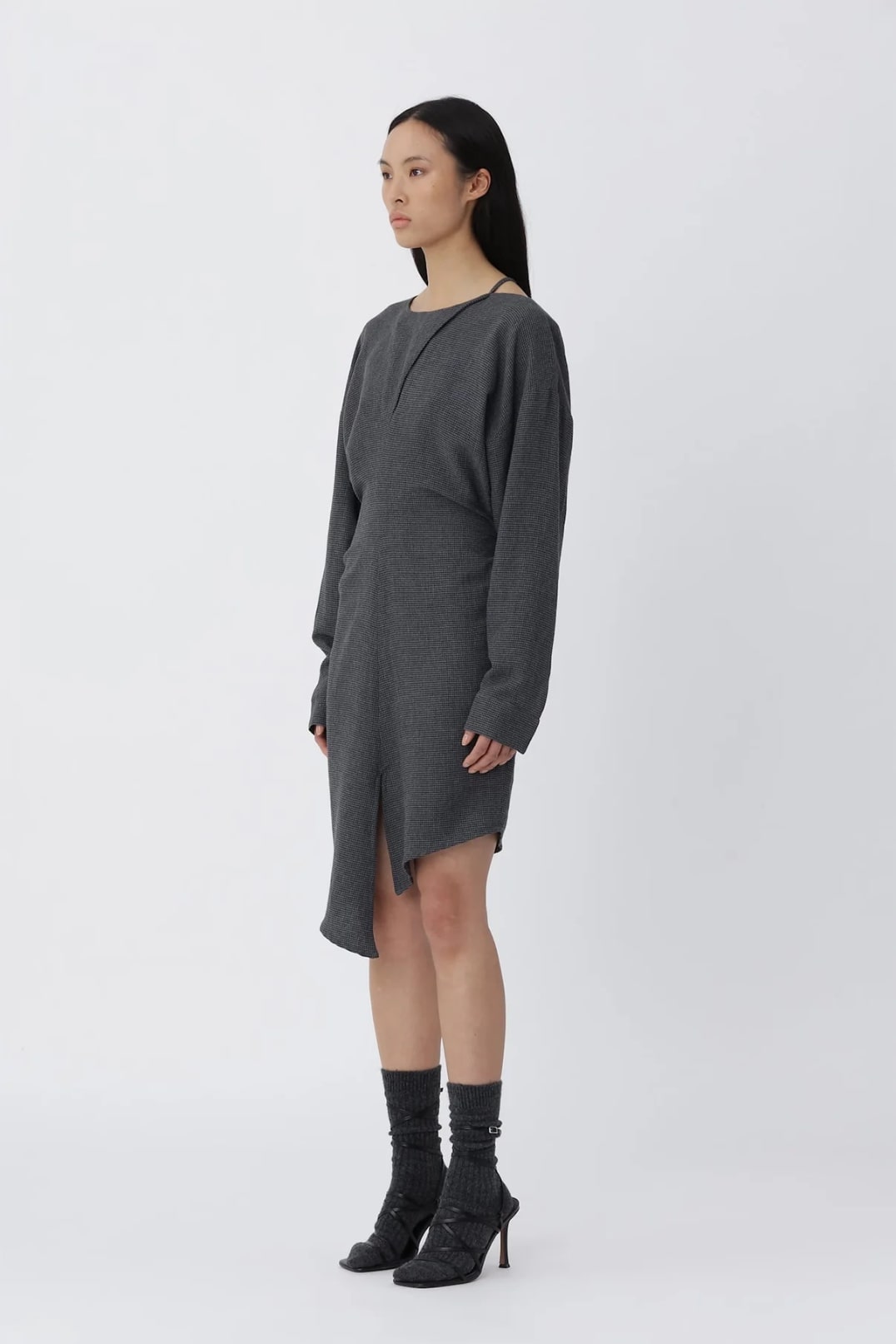 IT FEATURES A SUBTLE GREY TONAL CHECK WEAVE, COMBINING TEXTURE AND ELEGANCE IN A REFINED SILHOUETTE.