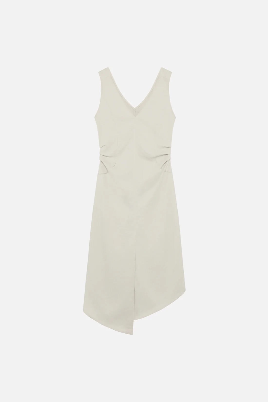 THE STYLE FEATURES A FITTED WAIST WITH PLEAT DETAILING, A MIDI-TO-MAXI LENGTH, AND AN ASYMMETRICAL HEMLINE WITH A HIGH FRONT SLIT FOR ADDED MOVEMENT.