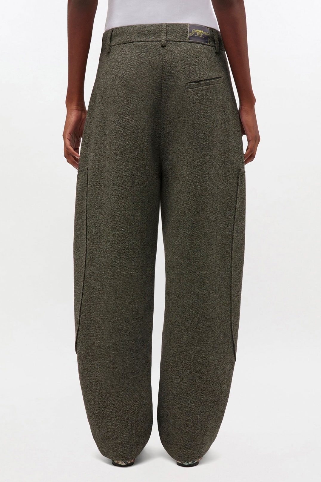 THESE TROUSERS FEATURE A HOOK AND ZIP CLOSURE, BELT LOOPS, 3 POCKETS AND A GANNI LOGO AT THE BACK POCKET.
