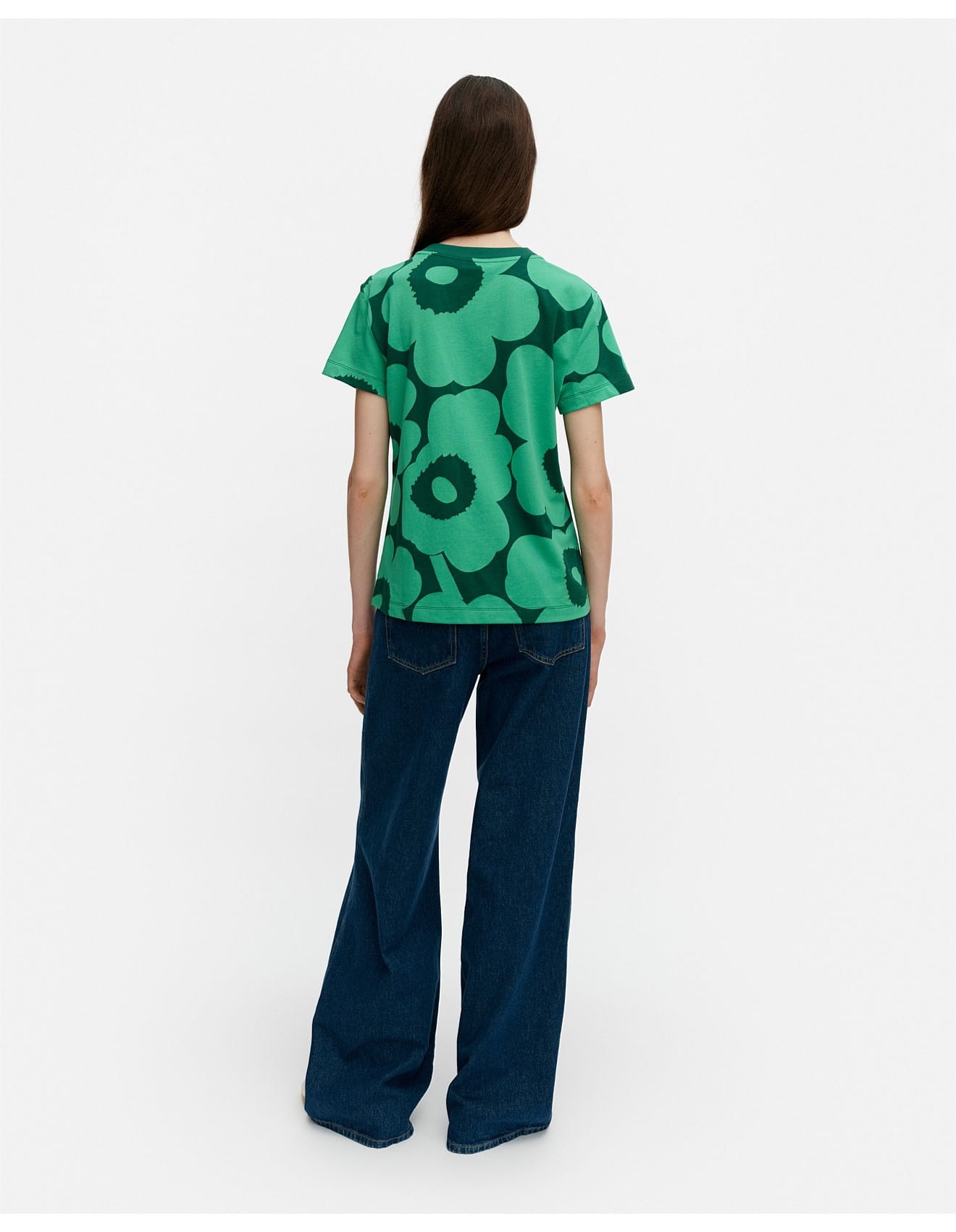 THE SHORT-SLEEVED TOP FEATURES THE UNIKKO PATTERN AND AN O-NECK WITH A RIB FINISH.
