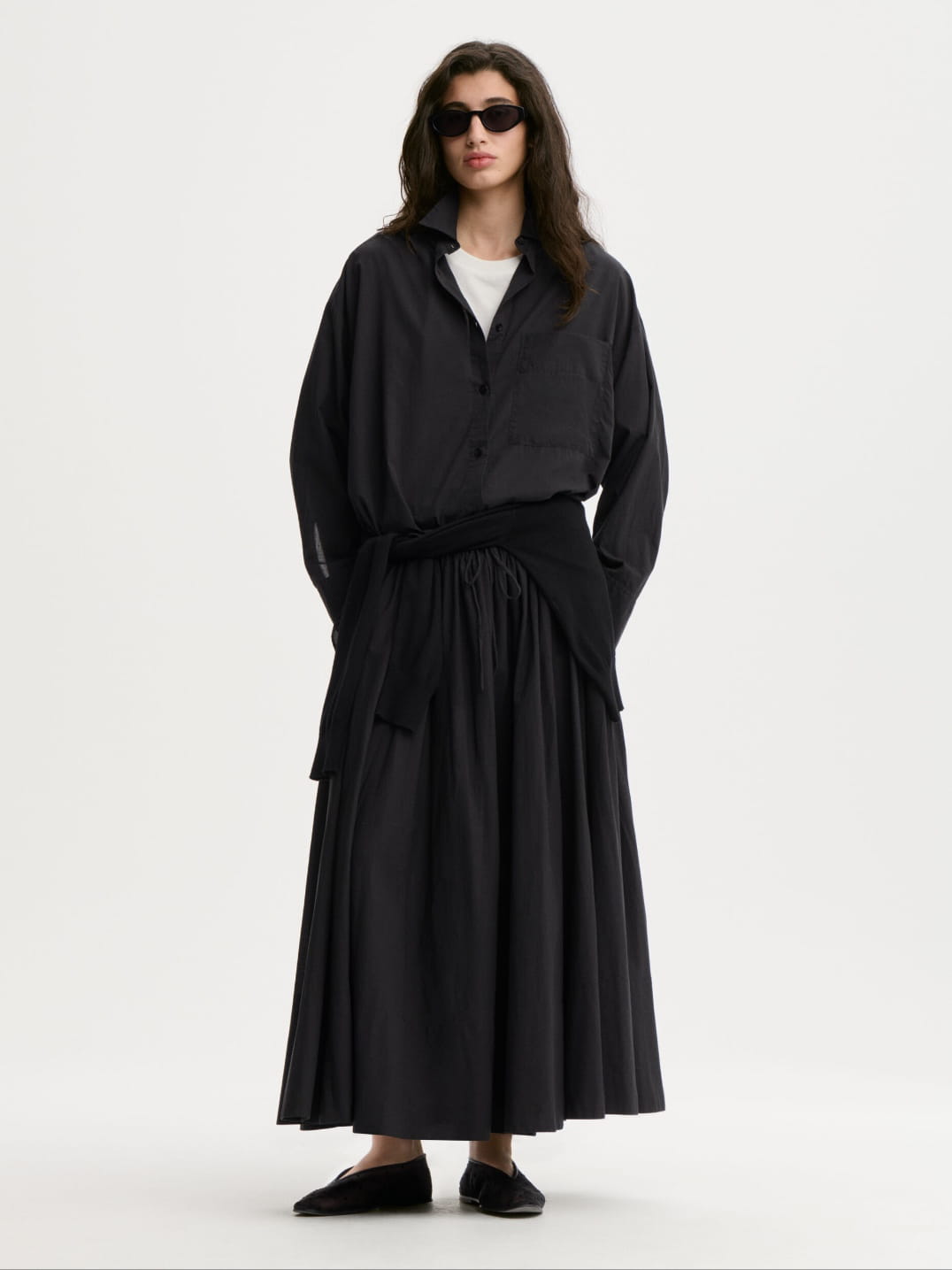 THE OVERSIZED SILHOUETTE IS COMPLEMENTED BY A MANDARIN COLLAR AND VOLUMINOUS 3/4 SLEEVES, GATHERED AT ELASTICATED CUFFS TO ADD SHAPE.