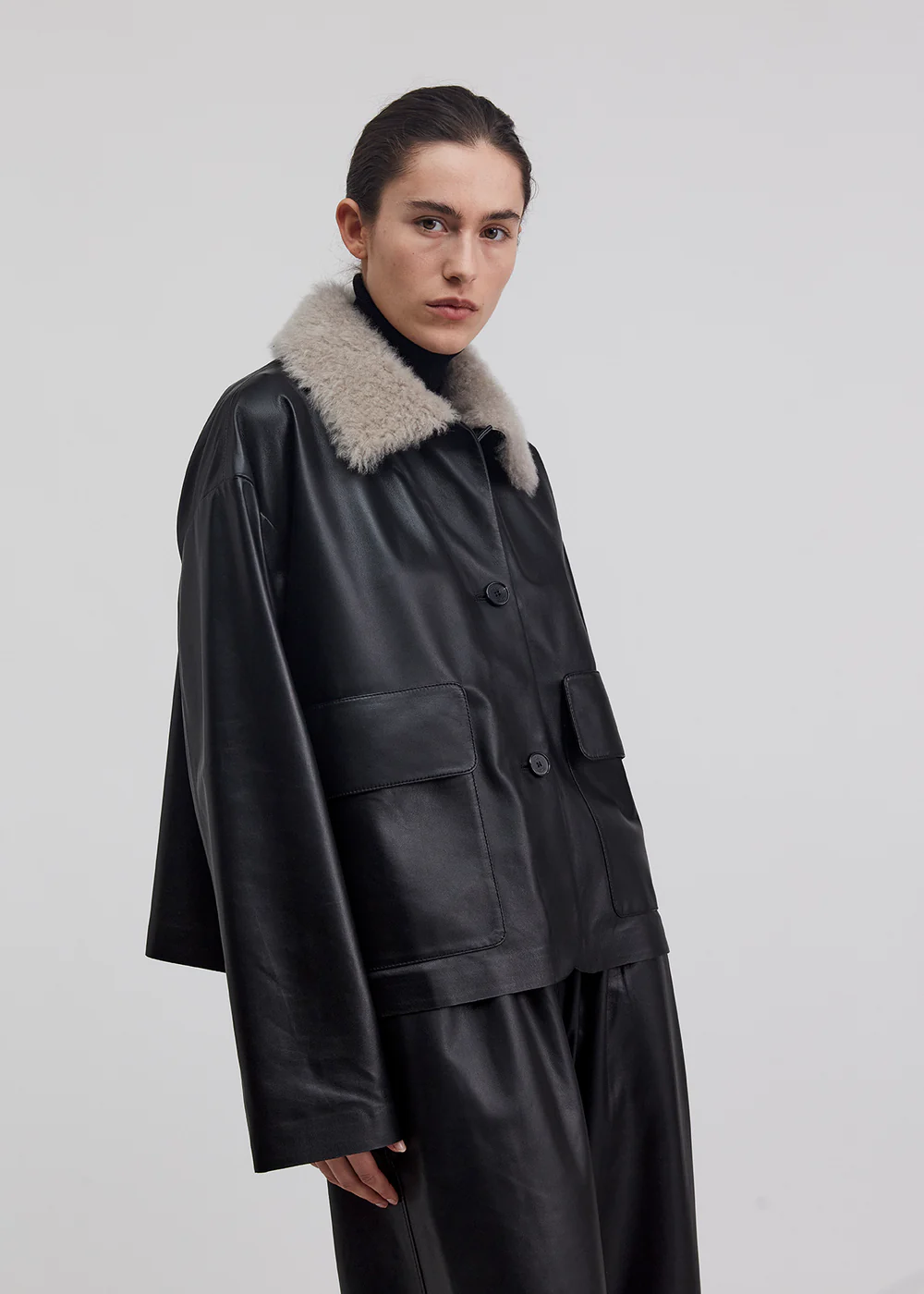 Jimmu Leather jacket with detachable shearling collar.