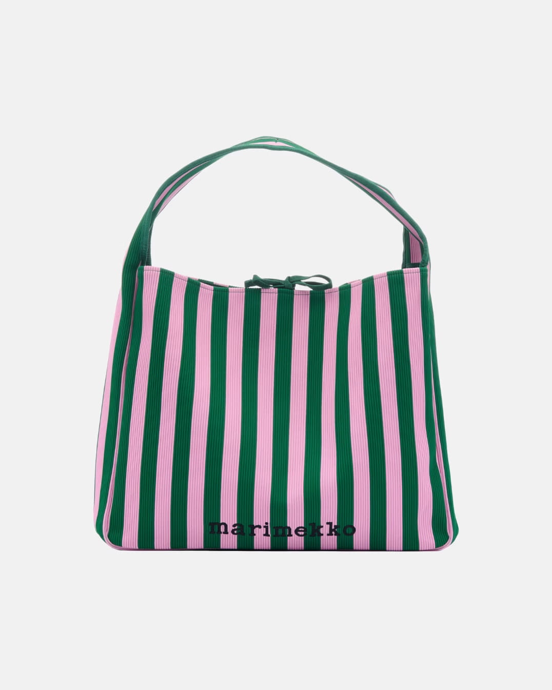 THE LARGE BAG FEATURES A WIDE SHOULDER STRAP, A RIBBON CLOSURE, AND THE EMBROIDERED MARIMEKKO LOGO ON THE FRONT.