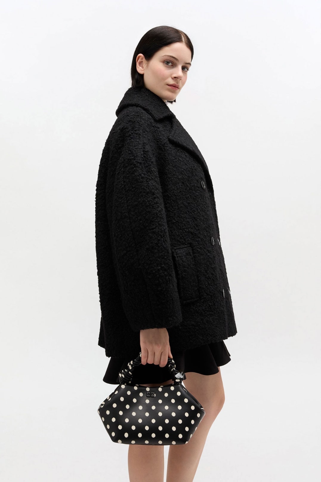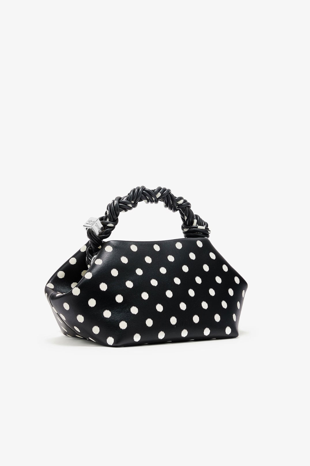 THIS BAG FEATURES A TONE-ON-TONE METALLIC GANNI BUTTERFLY LOGO, A TWISTED HANDLE WITH A BRAIDED KNOT, AND A METALLIC DICE WITH A GANNI BUTTERFLY LOGO ENGRAVED.