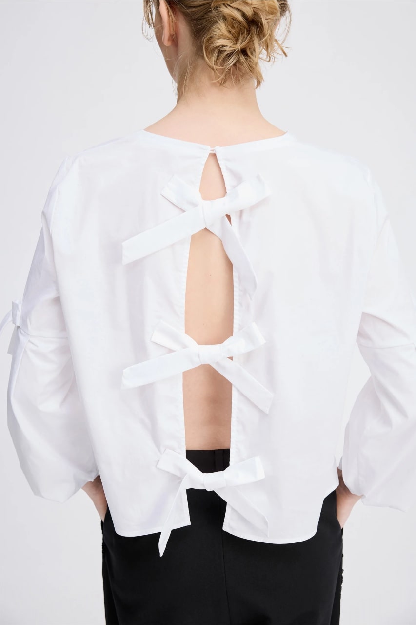 ELEGANT BLOUSE WITH DELICATE BOW DETAILS ON THE SLEEVES AND BACK.