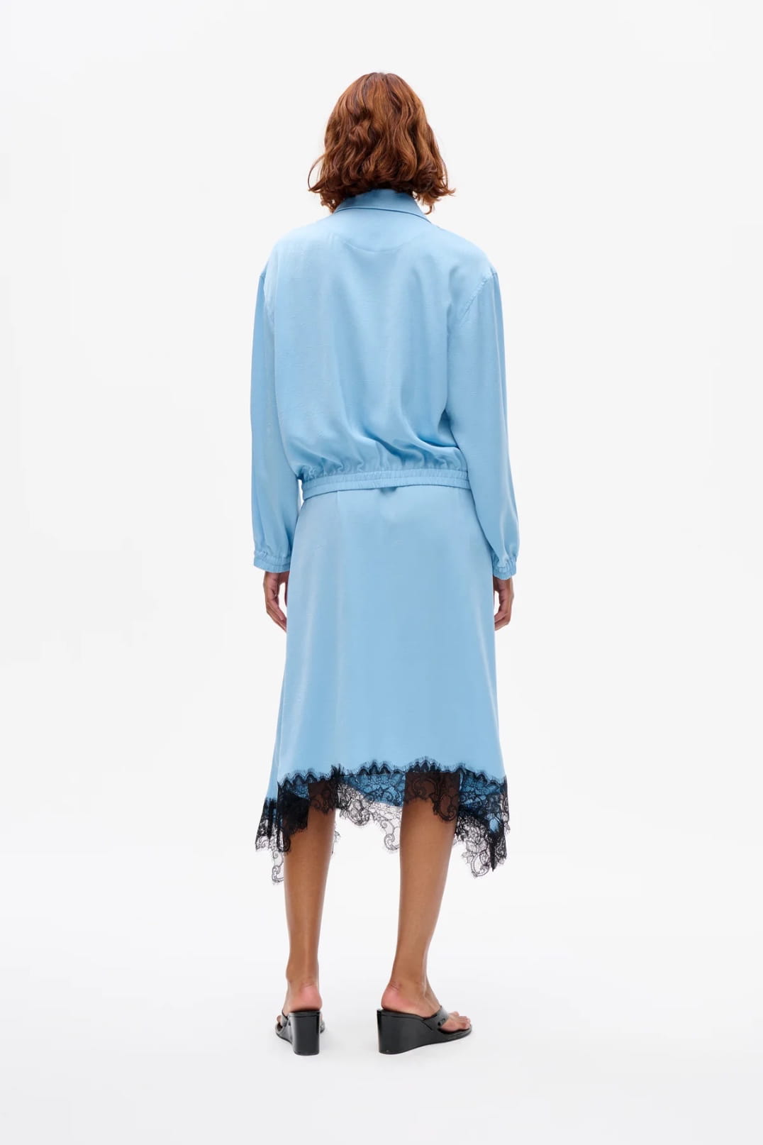 IT FEATURES AN ASYMMETRIC HEMLINE TRIMMED WITH DELICATE LACE.