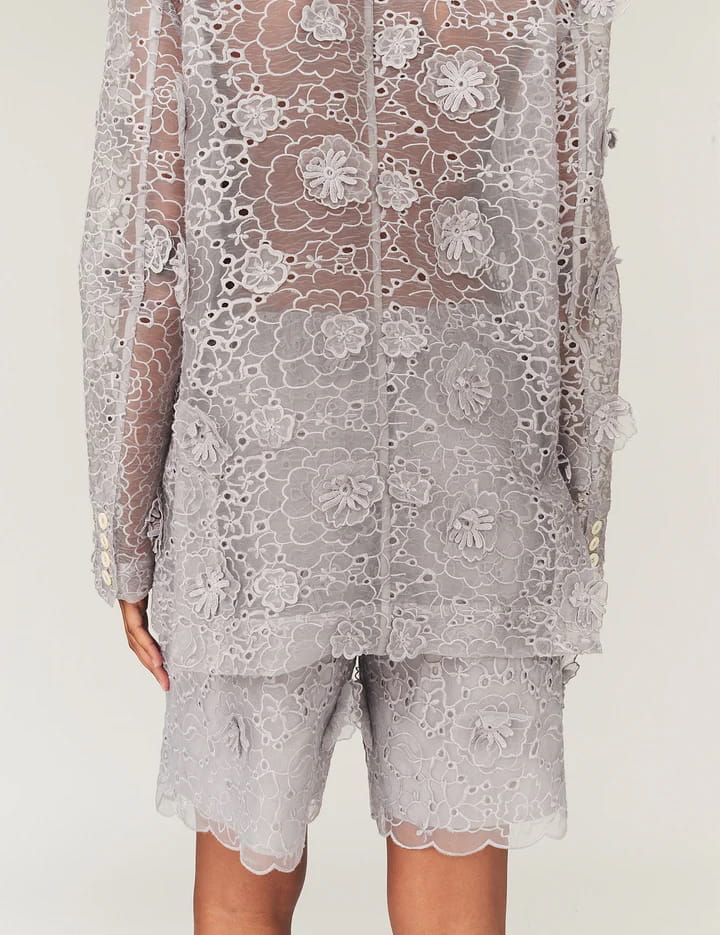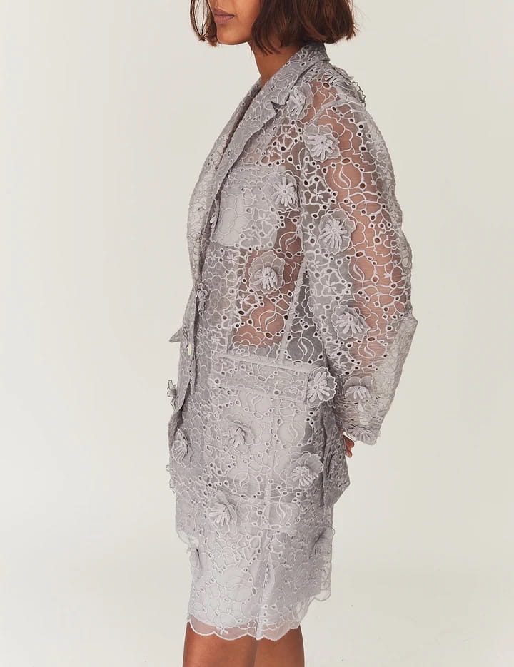 A TACTILE FLOWER TRANSPARENT BLAZER THAT ADDS TEXTURE AND LIGHTNESS, CREATING A FEMININE, MODERN SILHOUETTE WITH SUBTLE ELEGANCE.