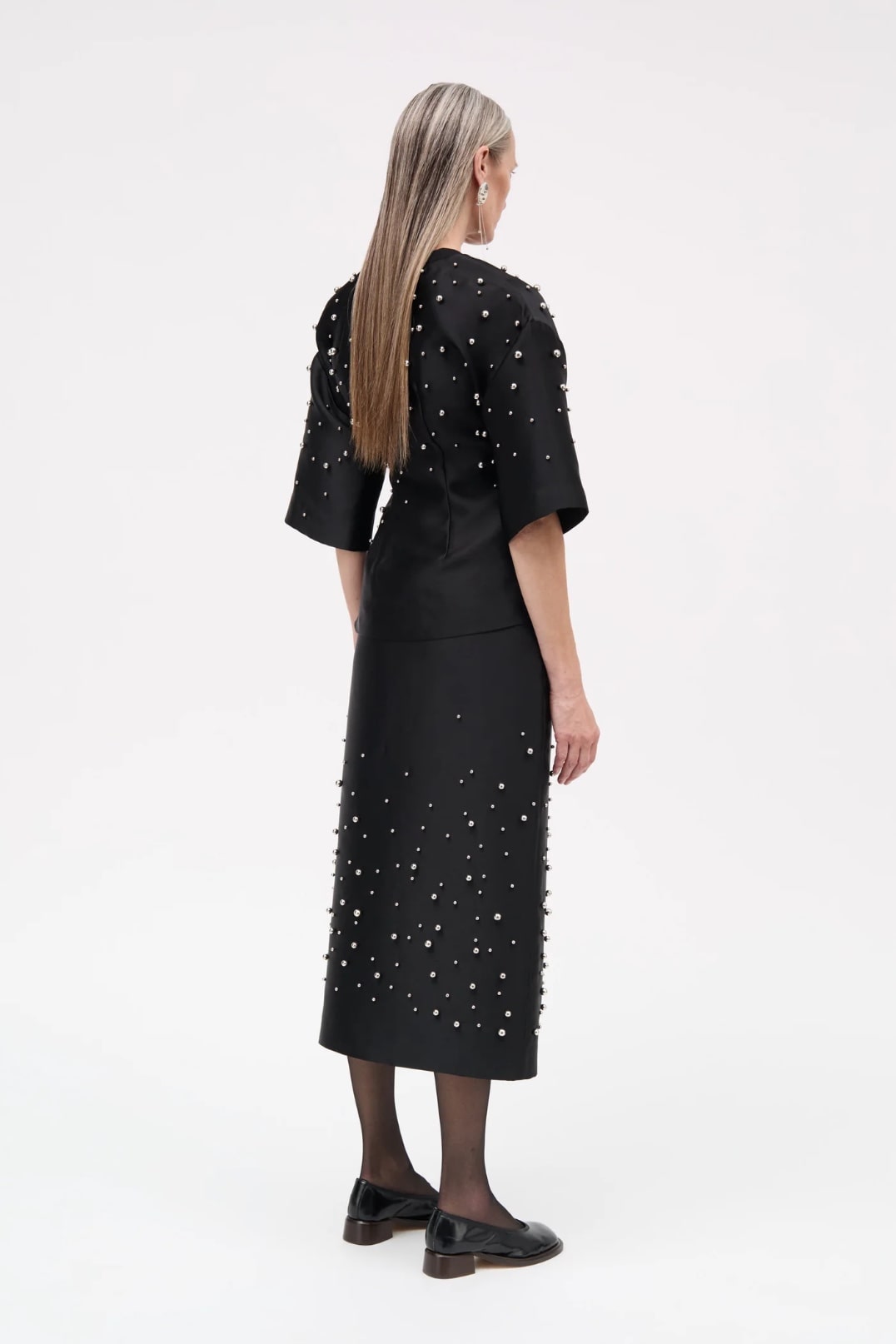 A REFINED SHORT-SLEEVE TOP DEFINED BY A CLEAN SILHOUETTE AND DELICATE STUD EMBELLISHMENTS.