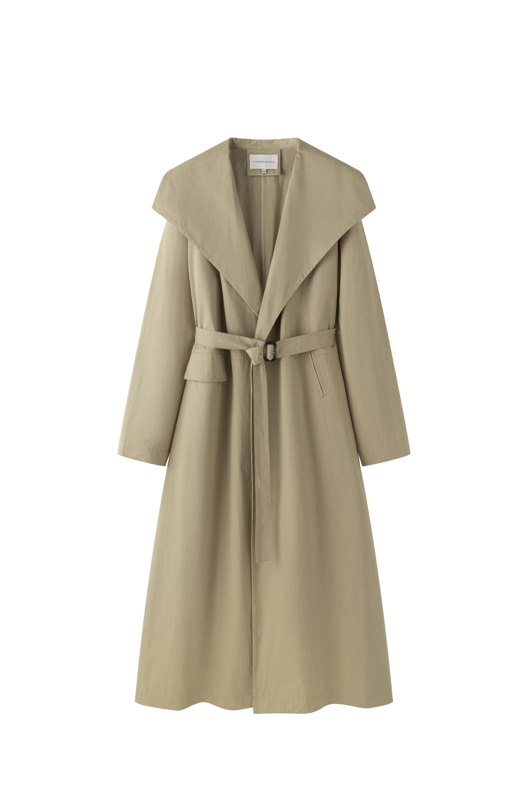 A KHAKI COTTON TRENCH COAT FEATURING AN OVERSIZED COLLAR AND A MATCHING BELT TO CINCH THE WAIST.
