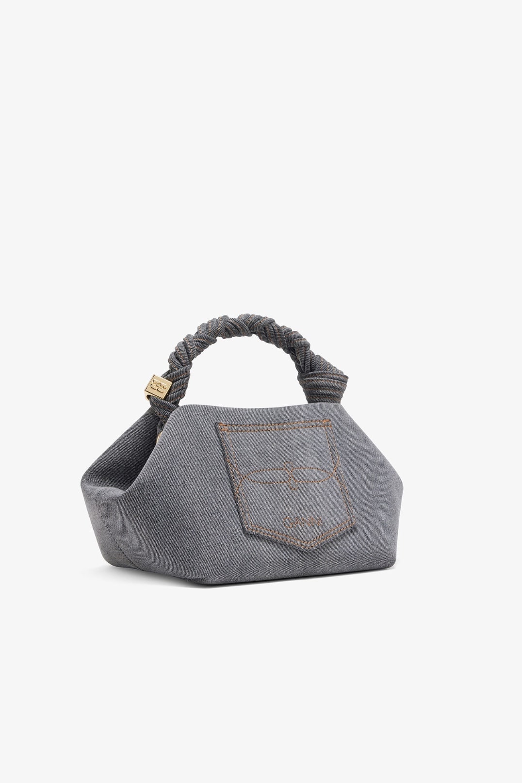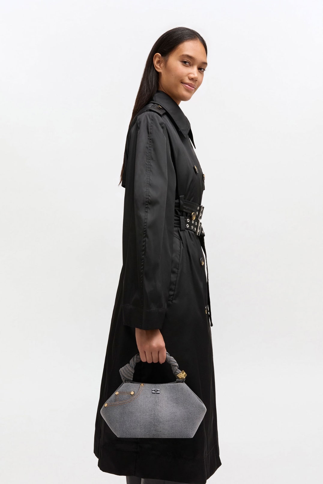 THIS BAG FEATURES A TONE-ON-TONE METALLIC GANNI BUTTERFLY LOGO, A TWISTED HANDLE WITH A BRAIDED KNOT, AND A METALLIC DICE WITH A GANNI BUTTERFLY LOGO ENGRAVED.